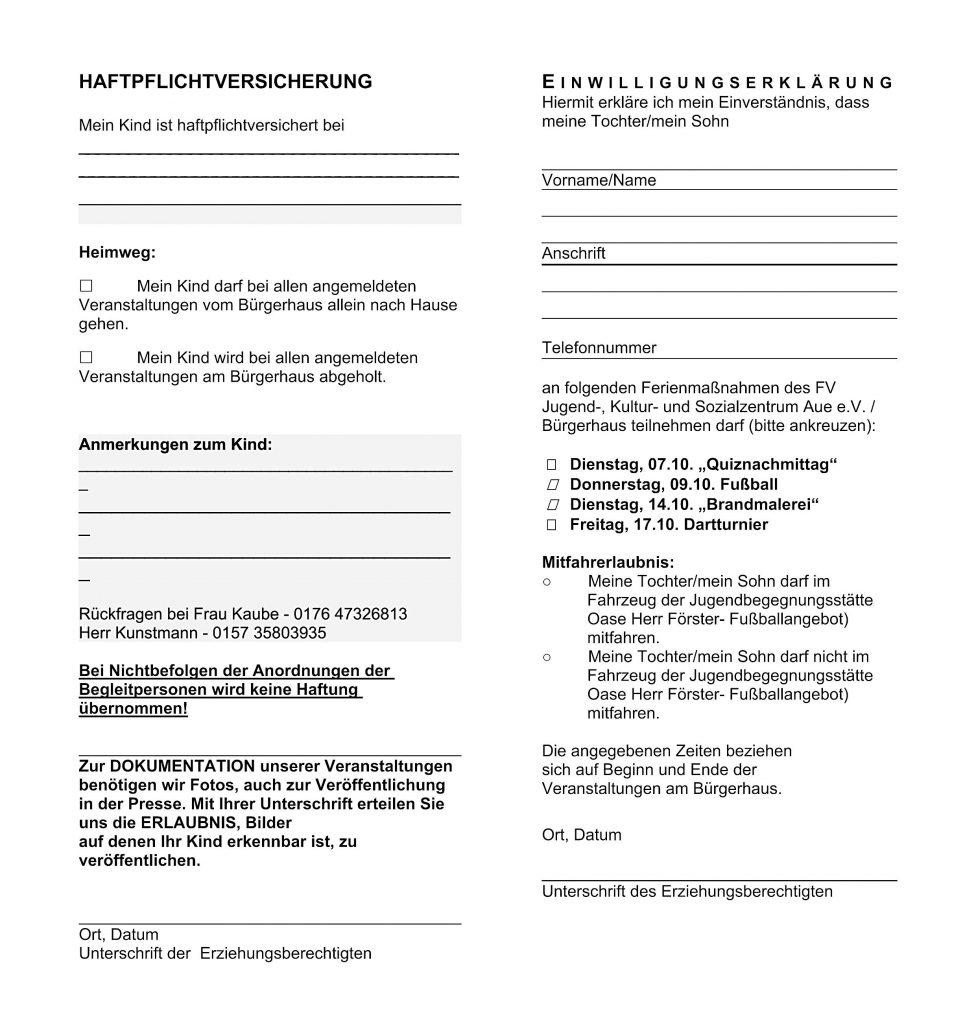 eine ausgefüllte EINWILLIGUNGSERKLÄRUNG von den Erziehungsberechtigten.